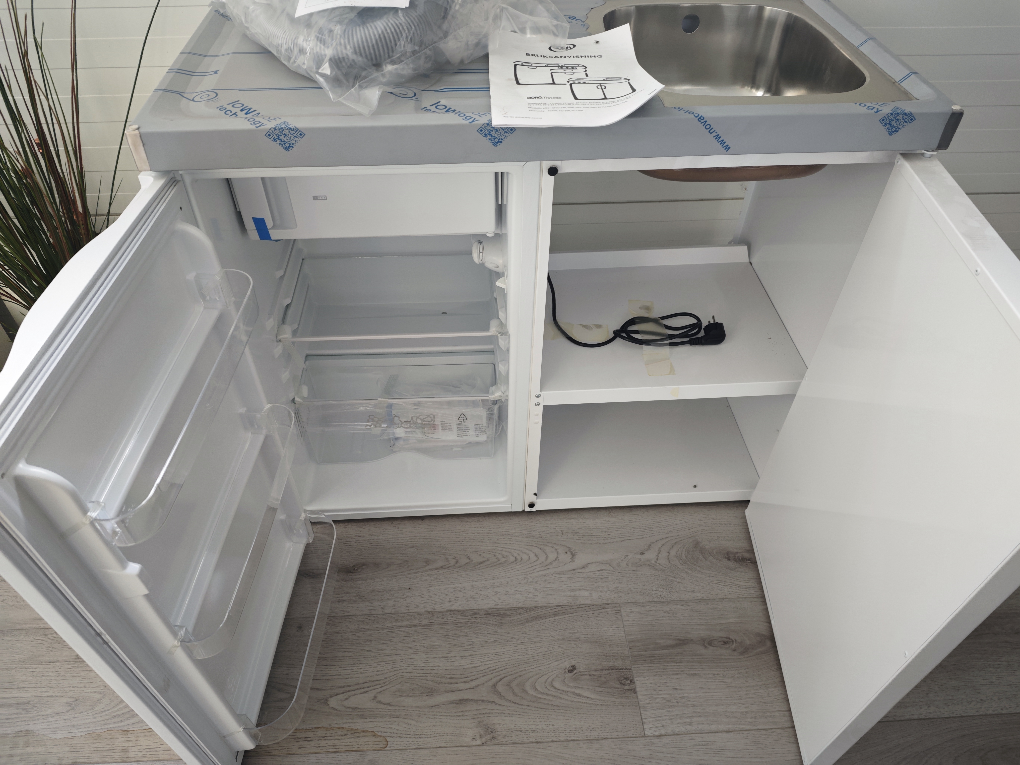 Har aldrig kommit till användning. Aldrig inkopplat. Integrerat kylskåp. Vattenlås medföljer. Ej kran.
