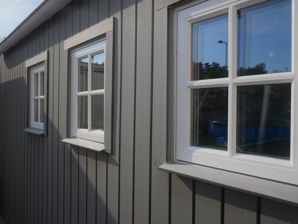 Fasadpanelen är snabbmonterad och kräver sedan inte mer än avtvättning vid behov. Runt knutar och fönster samt dörrar används våra täckbrädor, hörnlister samt täcklister som finns i samma kulörer och material. Fasadpanelen är tillverkad av träfiber och återvunnen plast (HDPE) och är också miljövänlig, eftersom den återanvänder spillmaterial från träindustrin och minskar avverkningen av skogar. Vi har 13 års erfarenhet vilket borgar för ett tryggt val. Vi har ett stabilt sortiment så att det går att komplettera i framtiden eller om en planka måste bytas.