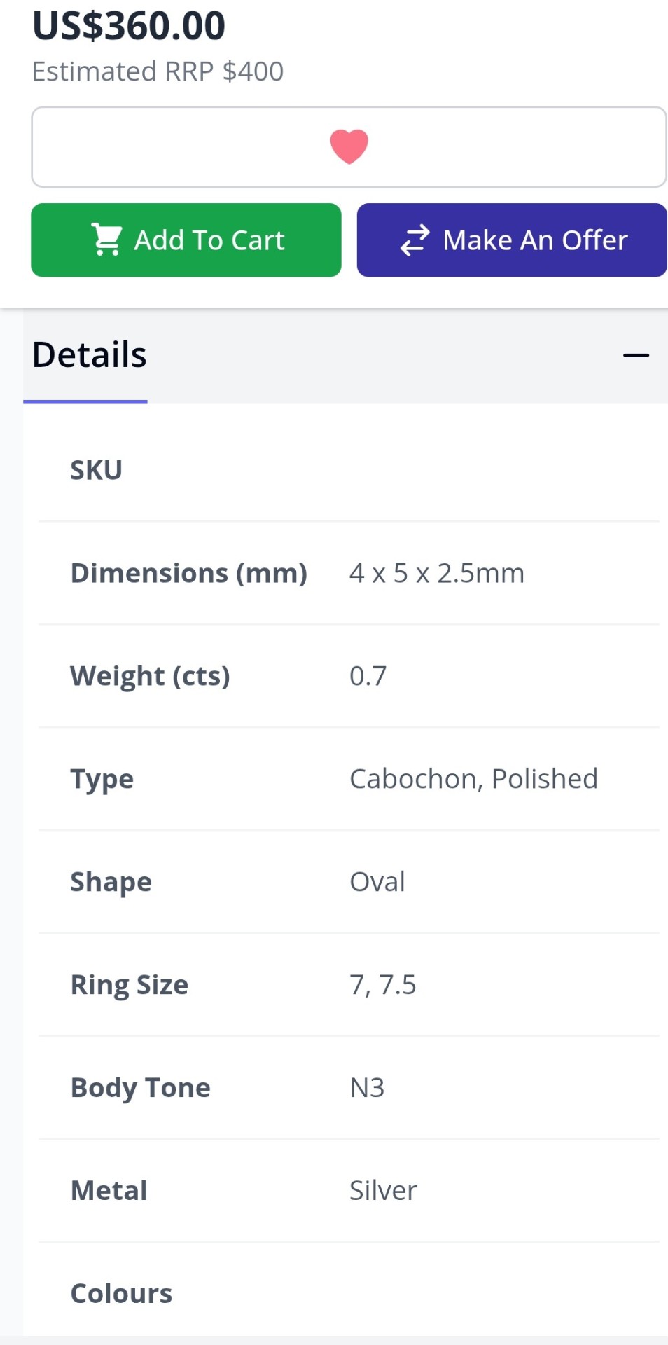 I am selling this Black Opal wich is 0.7 Ct's (4x5x2,5 mm thick). The ring is 925 Sterling Silver. The price is $360 but you can make offers in the shop. 15% off right now as well!Köp enklast via hemsidan om du önskar!